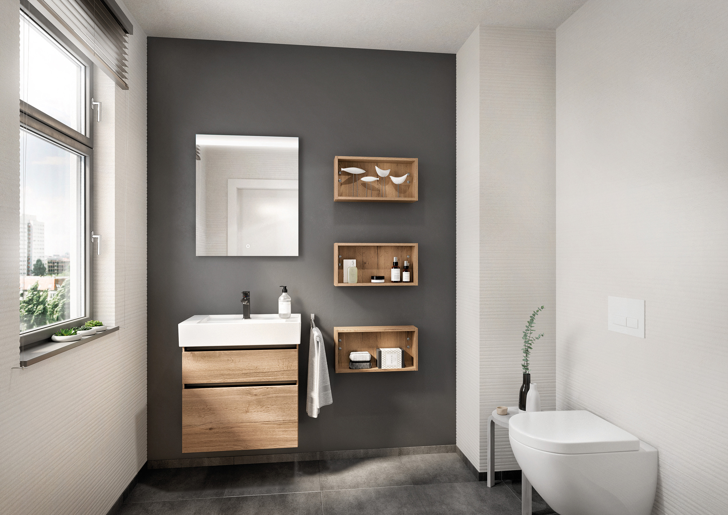 Recubierto por ambos lados con resina laminada, alrededor con canto de polímero en el color del frente. Lado interior de la puerta en el color del frente.
