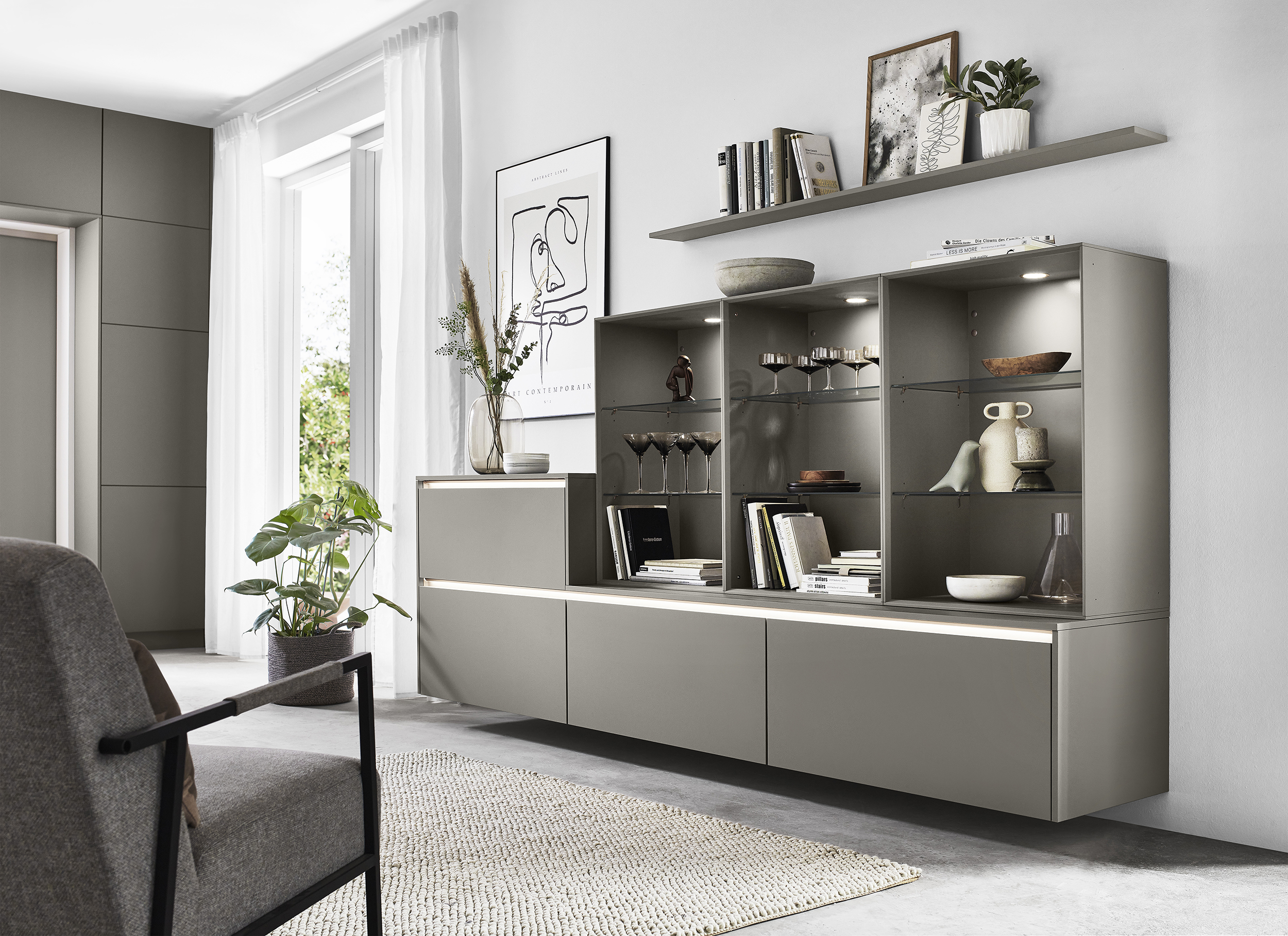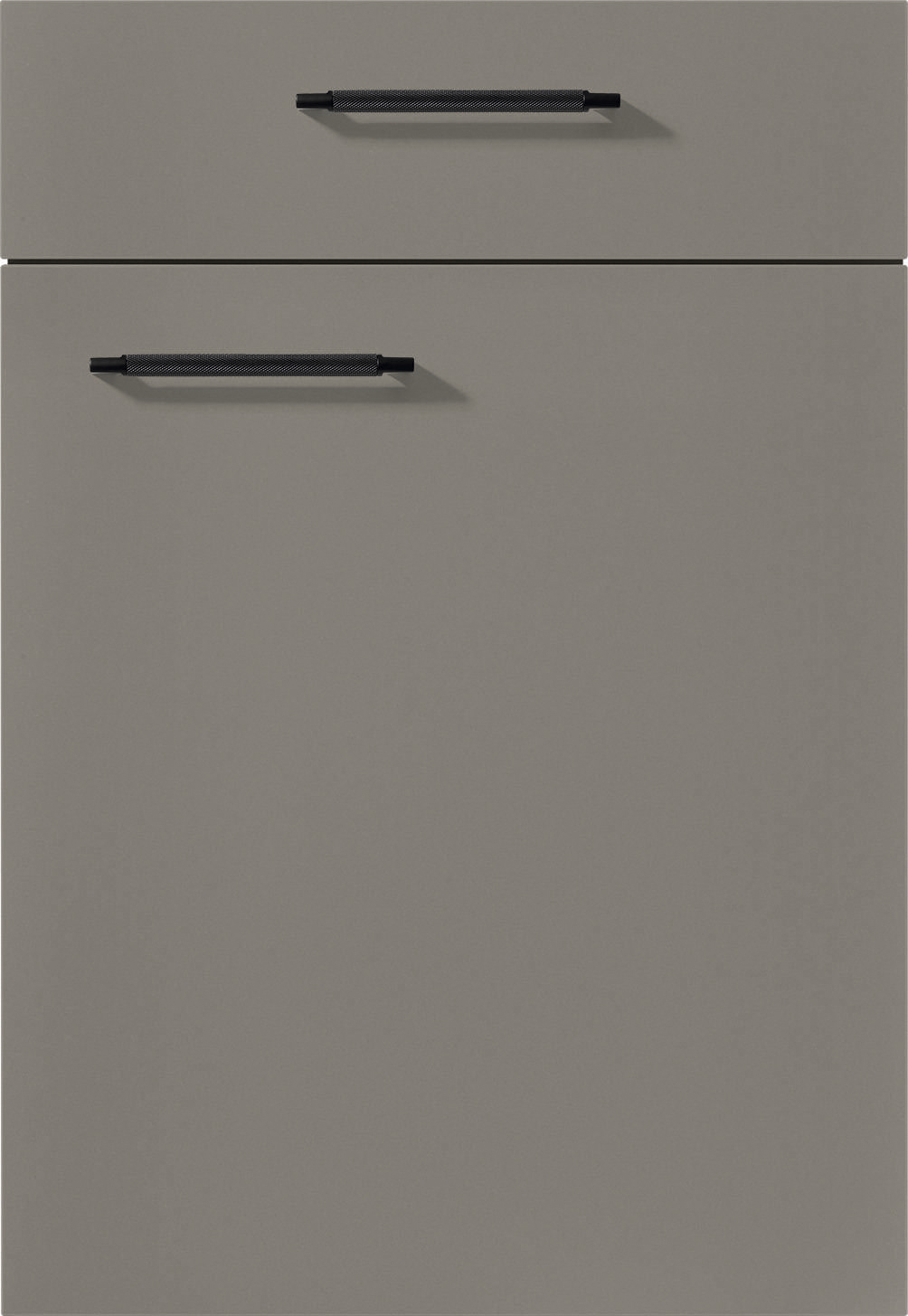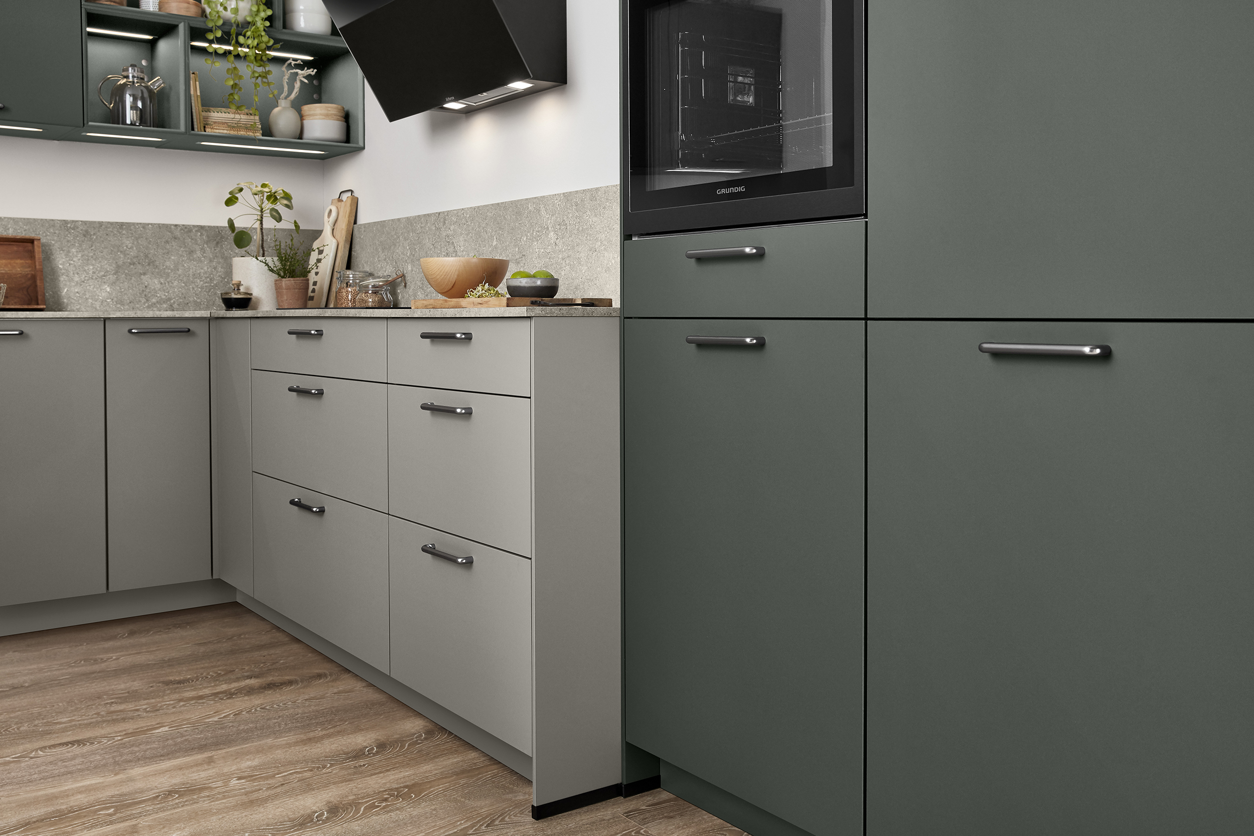 Frente de laminado lacado con revestimiento antihuellas, alrededor con canto de polímero en el color del frente. Lado interior de la puerta en el color del frente.