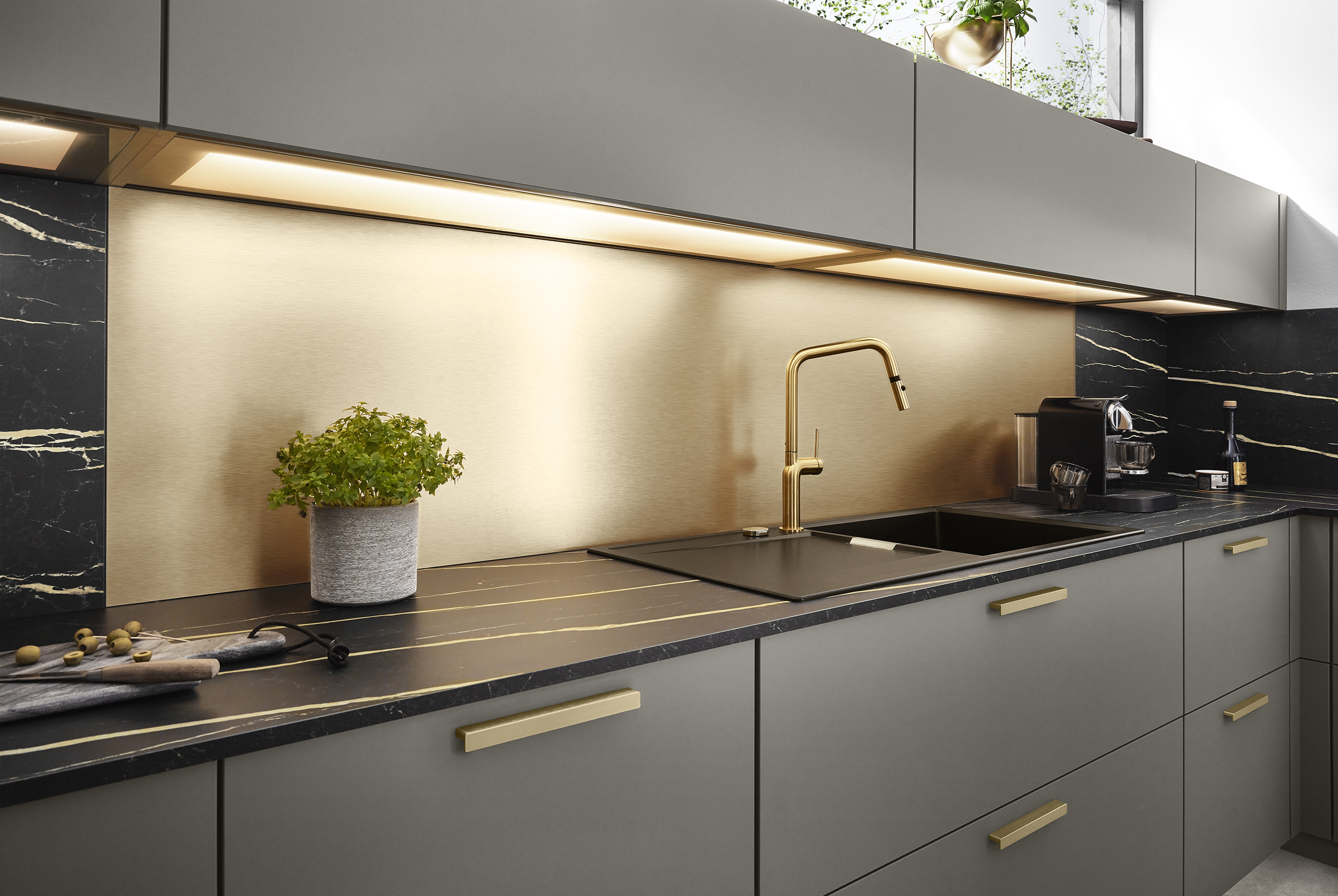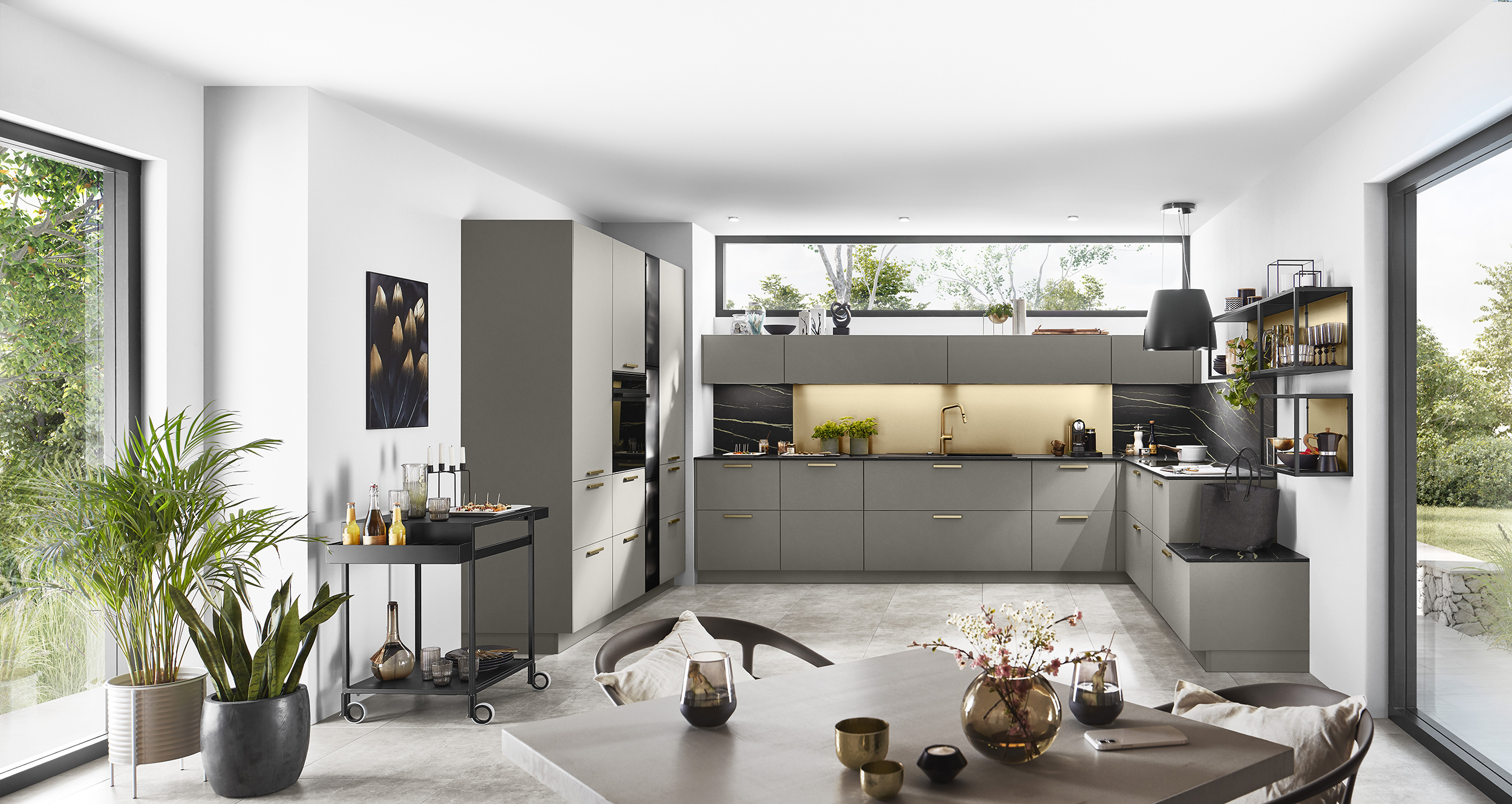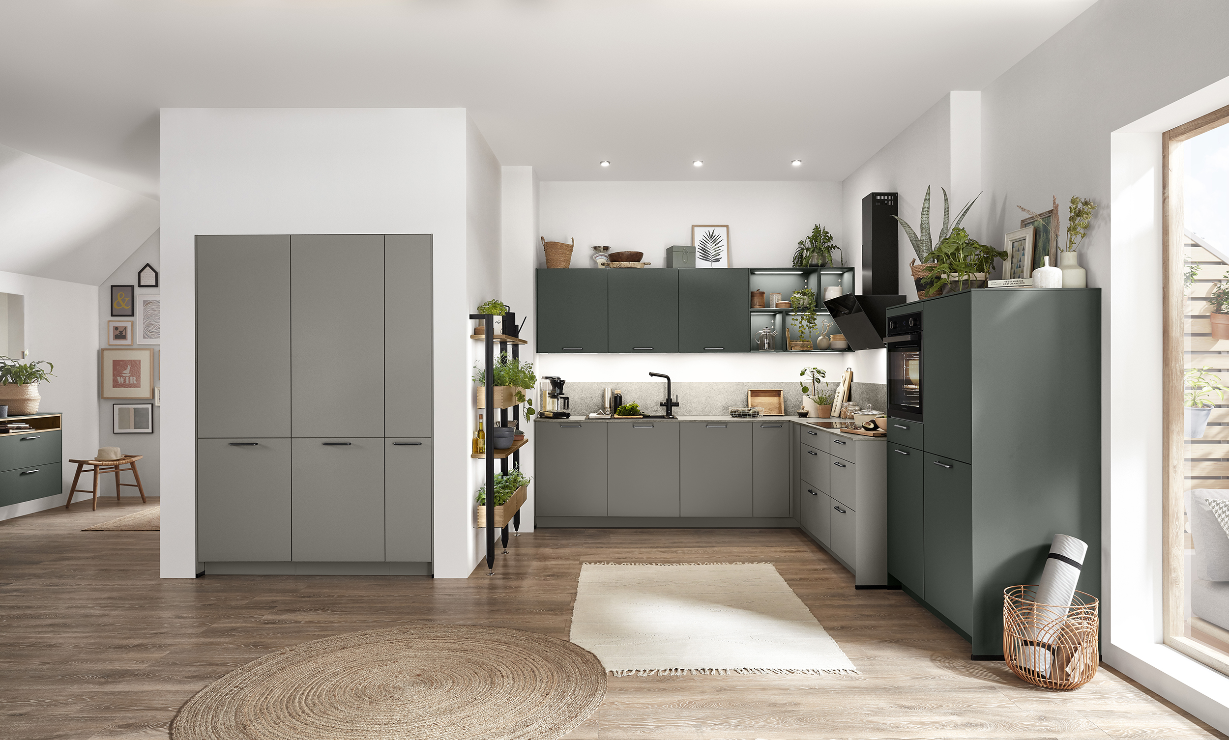 Frente de laminado lacado con revestimiento antihuellas, alrededor con canto de polímero en el color del frente. Lado interior de la puerta en el color del frente.